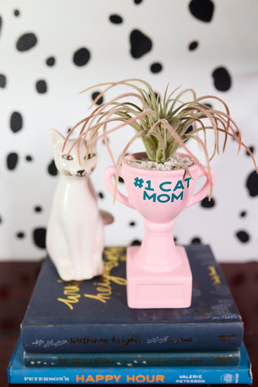 Perfect for the friend who’s the ultimate cat mom, this quirky planter is a nod to their endless devotion to their feline friends. Whether they’re pampering their cats or sharing adorable photos, this faux succulent trophy is the ideal accessory to adorn their mantel or desktop. Add a touch of humor and greenery to your space with our ceramic trophy succulent planter. Whether for yourself or as a gift, it's sure to bring smiles and a splash of color to any room!