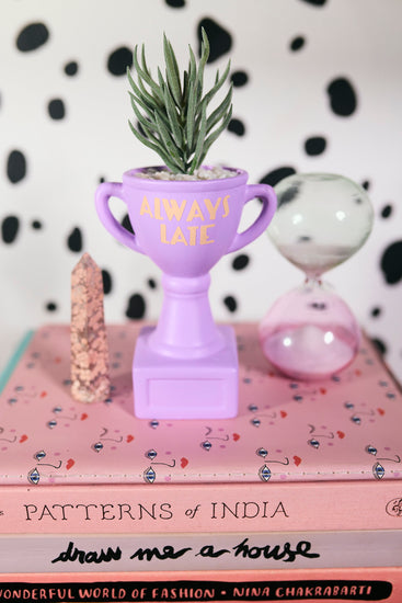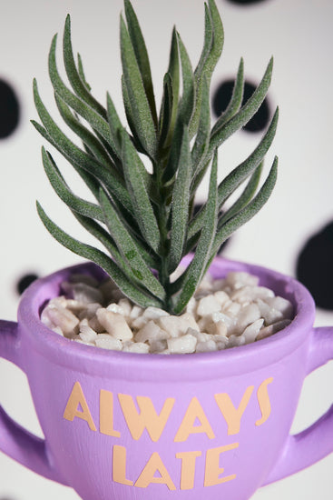 Celebrate your perpetually tardy ways with our handcrafted ceramic trophy faux succulent planter! Each piece is made to resemble a miniature trophy, adorned with the award "Always Late". Perfect for those without a green thumb, this planter features the faux succulent pictured, nestled in small white gravel, ensuring maintenance-free beauty.