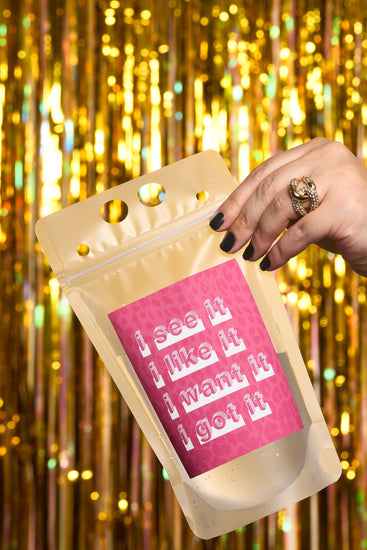 Pouch is 5” wide and 9” tall. It has two large holes for easy carrying and two small holes for your straw. Pouches are re-sealable are re-usable. Holds up to 16oz. All labels are waterproof!