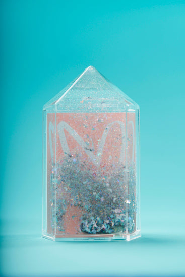 -Gem shaped frame that's filled with shaky shimmering silver glitter.