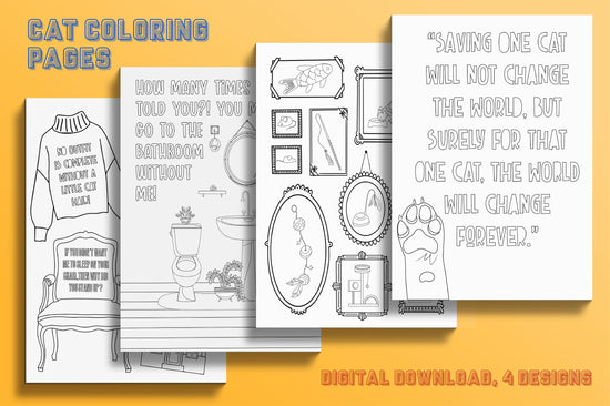 Introducing our delightful Cat Coloring Pages: a purrfect blend of feline charm and artistic creativity! This digital download printable product features four designs inspired by the hilarious antics and mischievous adventures of our beloved furry friends.