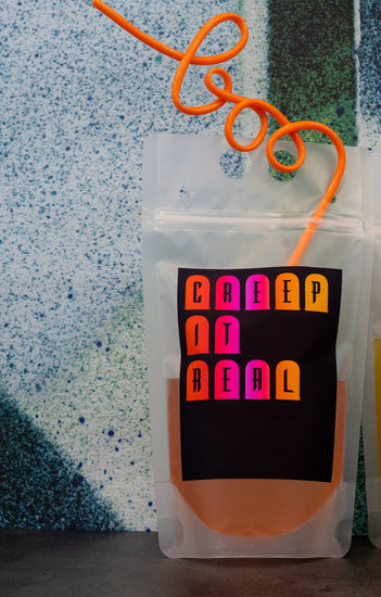 Each pouch is 5” wide and 9” tall. It has two large holes for easy carrying and two small holes for your straw. Pouches are re-sealable are re-usable. Holds up to 16oz. All labels are waterproof!