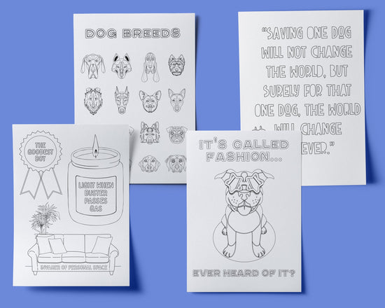 Introducing our delightful Dog Coloring Pages: a blend of charm and artistic creativity! This digital download printable product features four designs inspired by the hilarious antics and mischievous adventures of our beloved furry friends.