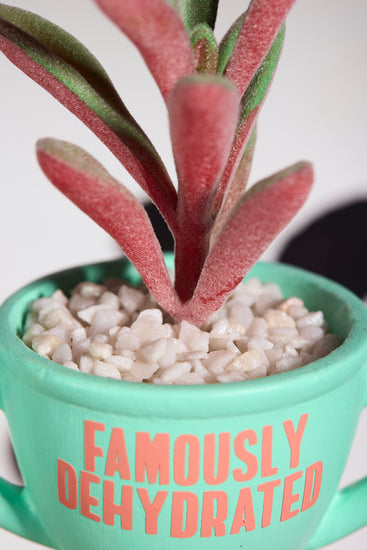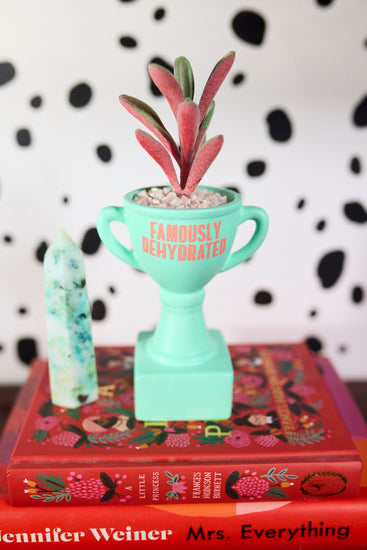 Celebrate your sense of humor with our charming handcrafted ceramic trophy faux succulent planter! Each piece is carefully crafted to resemble a miniature trophy, adorned with the playful award "Famously Dehydrated". Perfect for those without a green thumb, this planter features the faux succulent pictured, nestled in small white gravel, ensuring maintenance-free beauty.