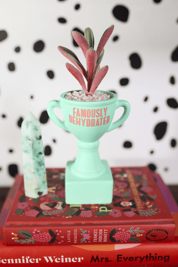 Perfect for the friend who always forgets to drink water, this quirky planter is a fun nod to their perpetually parched state. Whether they’re laughing off their hydration habits or sharing tips on staying hydrated, this faux succulent trophy is the ideal accessory to adorn their mantel or desktop. Add a touch of humor and greenery to your space with our ceramic trophy succulent planter. Whether for yourself or as a gift, it's sure to bring smiles and a splash of color to any room!