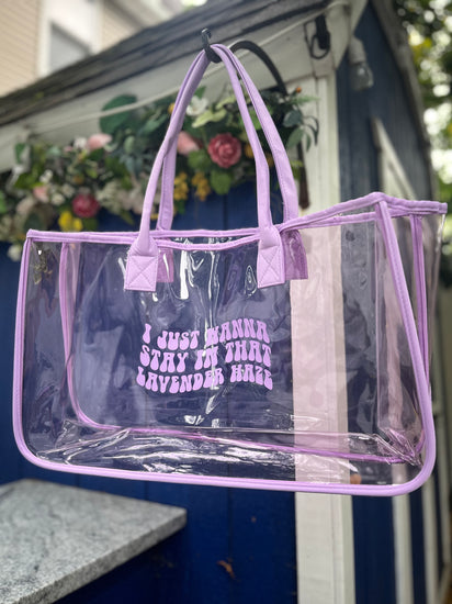 Calling all Swifties! Get ready with our fabulous Taylor Swift tote, crafted from high-quality clear plastic with a dreamy lavender trim, this tote measures a generous 19.5” W x 11.5” H x 5” D, featuring 10” handles that promise comfort as you carry your essentials and channeling your inner Tay.