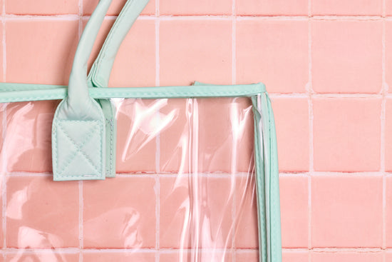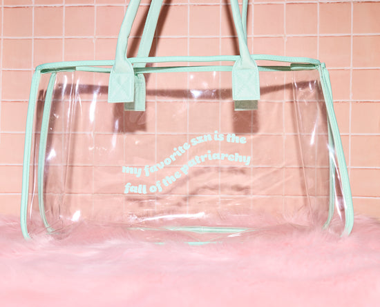 Get ready to turn heads and make waves with this large clear tote trimmed in mint, designed for feminists who celebrate fall in every sense. Measuring a roomy 19.5” W x 11.5” H x 5” D with a 10” handle drop, it's the perfect carryall for beach days, weekend escapes, or that epic bachelorette.