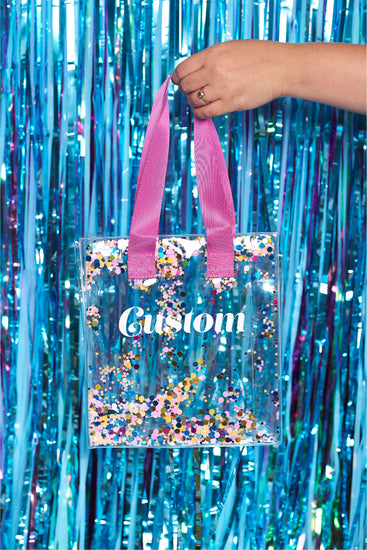 This confetti filled mini tote is made of heavy duty vinyl that is easy to clean making it not only fun and functional! Perfect for a beach day, bachelorette gift bag, party favor bag or just when you need a little sparkle.