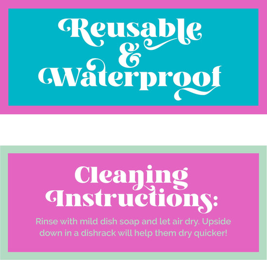 Each pouch is 5” wide and 9” tall. It has two large holes for easy carrying and two small holes to put your straw in. Pouches are re-sealable are re-usable. Holds up to 16oz. and all labels are waterproof! To clean just rinse with mild soap and let air dry. Plastic is biodegradable and environmentally friendly!