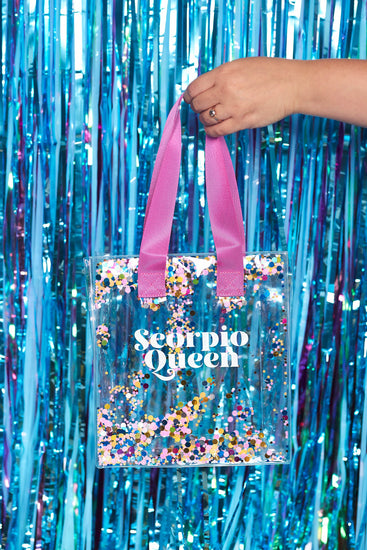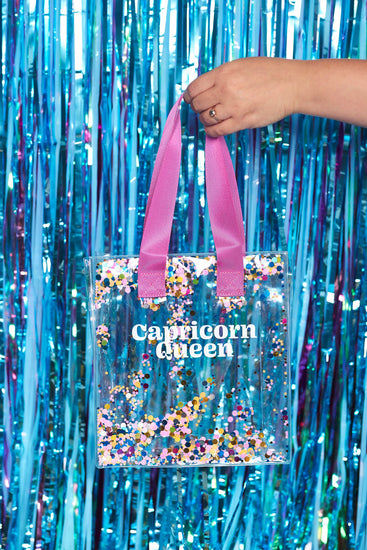 Show off your astrological pride with this glitter-filled mini tote bag! Made from clear plastic with glitter that shines brighter than your horoscope, it features pink straps and a personalized design of your zodiac sign. Perfect for astrology buffs! Whether you're a fiery Aries, a grounded Taurus, or any sign in between, this bag lets you carry your essentials with a side of cosmic flair. Choose your sign and let the world know you’re guided by the stars.